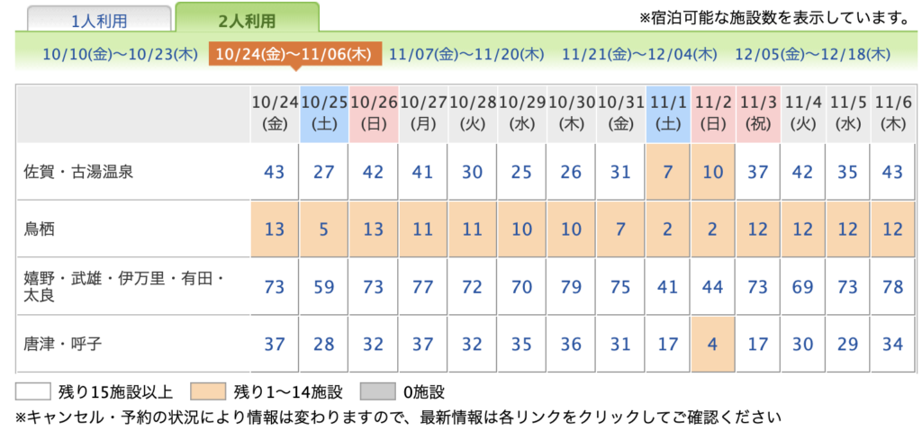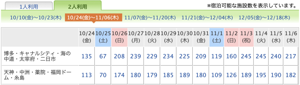 やはり開催期間中の佐賀市は、前の週末と比較しても空きが少ないですね。